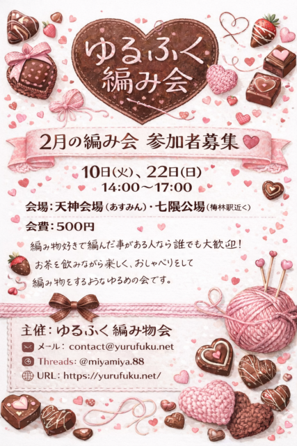 お茶を飲みながら楽しくおしゃべりして、ゆる〜く編み物を楽しむ会です。